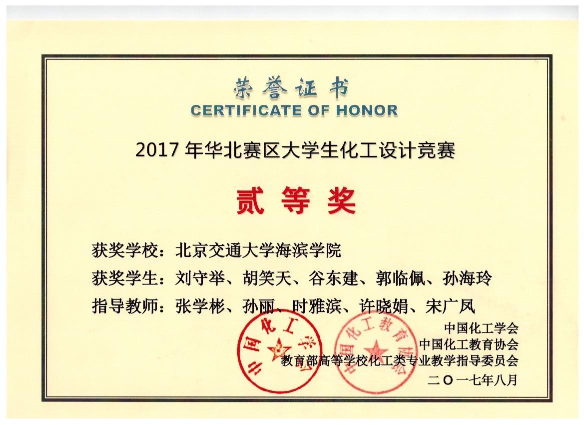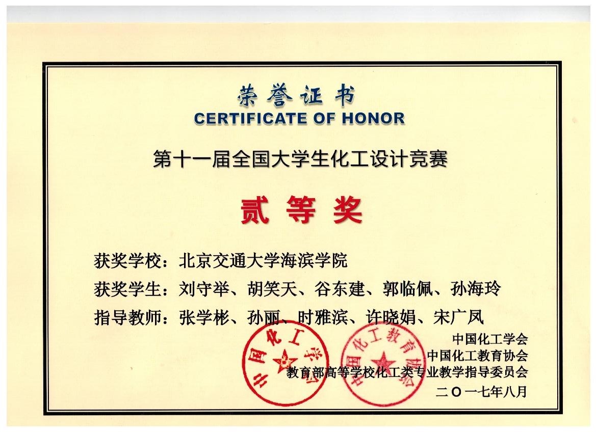 2017年8月3日-5日,由中国化工学会、中国化工教育协会、教育部高等学校化学工程与工艺专业教育指导分委员会联合主办,北京化工大学承办的2017年“东方仿真杯”第十一届全国大学生化工设计竞赛华北赛区竞赛在北京化工大学隆重举行。由德赢官网化学工程系的张学彬、孙丽、时雅滨、许晓娟、宋广凤老师指导的团队(刘守举、胡笑天、谷东建、郭临佩、孙海玲)在华北赛区取得赛区二等奖,经不懈努力最终荣获全国化工设计大赛二等奖。与此同时,我院参加化工设计大赛的另外两支由贾婷、焦帅为队长带领的队伍同样获得了优异的成绩。