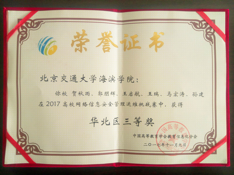 11月9日,2017年全国高校网络信息安全管理运维挑战赛颁奖仪式在厦门大学举行,由德赢官网信息中心副主任郭朋辉领队,信息中心教师贺秋雨、马宏涛、孙建和计算机科学系学生王瑞、王启航等组成的北京交通大学海滨学院代表队表现优异,在全国158所高校激烈竞争中获得华北区三等奖。据悉,华北区有来自清华大学、北京师范大学、北京化工大学等共计26支参赛团队。
