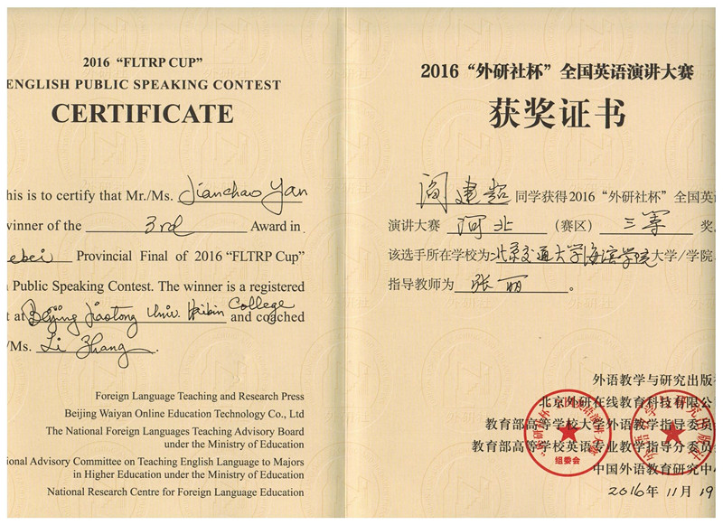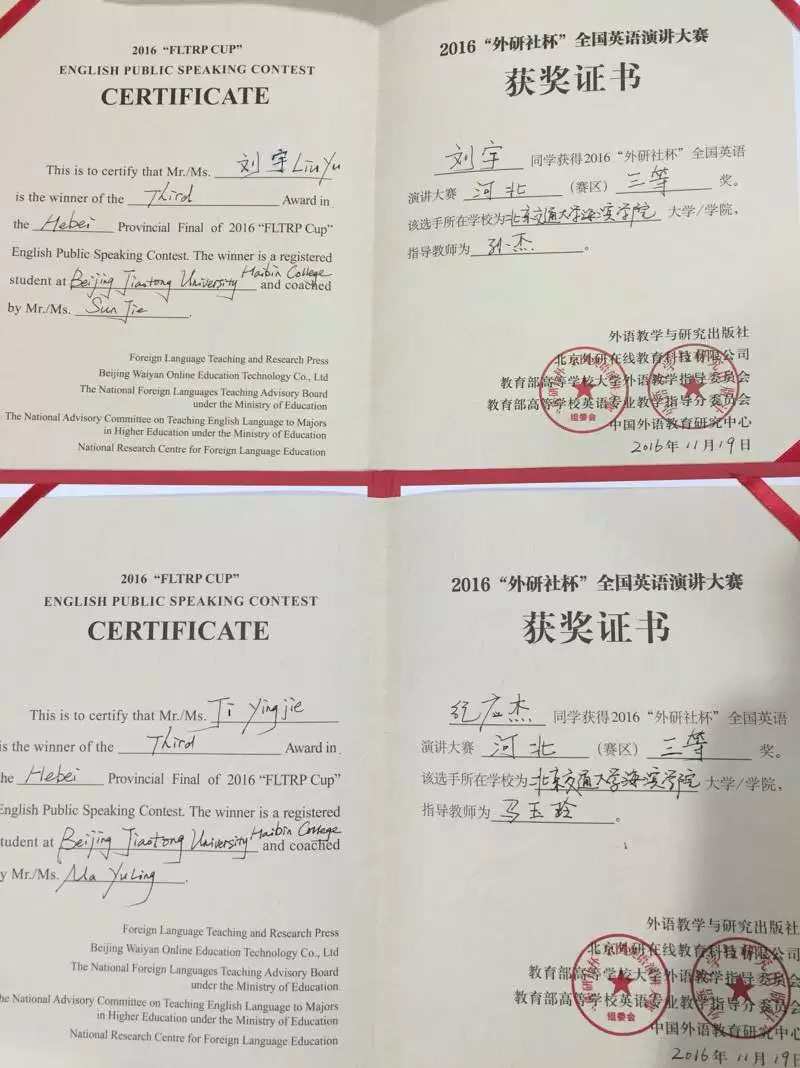 2016年11月18日—20日,河北省高等学校第十七届“世纪之星”英语演讲大赛在唐山师范学院举行,来自全省73所高校的481名参赛选手及其指导教师参加了比赛。经过两天的激烈角逐,最终,德赢官网外语系教师宋琳琳荣获“青年教师组”二等奖,基础教学部大学英语教研室教师孙杰荣获“青年教师组”三等奖,交运系学生刘宇、计科系学生纪应杰、外语系学生闫建超荣获大赛三等奖,基础教学部大学英语教研室主任马玉玲荣获优秀指导教师奖。