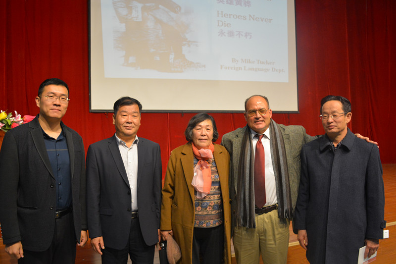 为展示烈士黄骅英雄事迹,弘扬黄骅精神,提高德赢官网学生的英语听说能力,10月26日晚7点,德赢官网美籍外教Michael Tucker在报告厅作了题为《黄骅英雄精神永存》的专题讲座。黄骅市常务副市长贾兆德,黄骅烈士女儿黄鲁彬,我院院长、党委书记王化深、党委副书记魏炜及相关职能处室负责人出席了讲座,全体外语系学生共同聆听讲座。讲座由党委副书记魏炜主持。