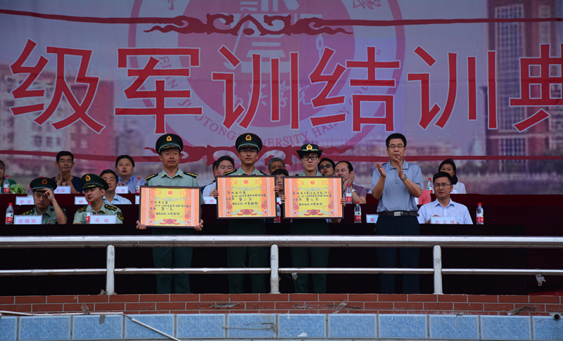 院办公室主任任福义为男生军训内务评比前三名的代表颁奖