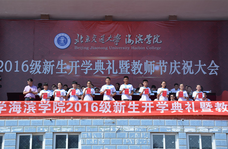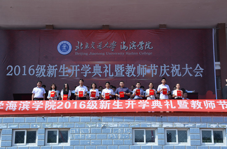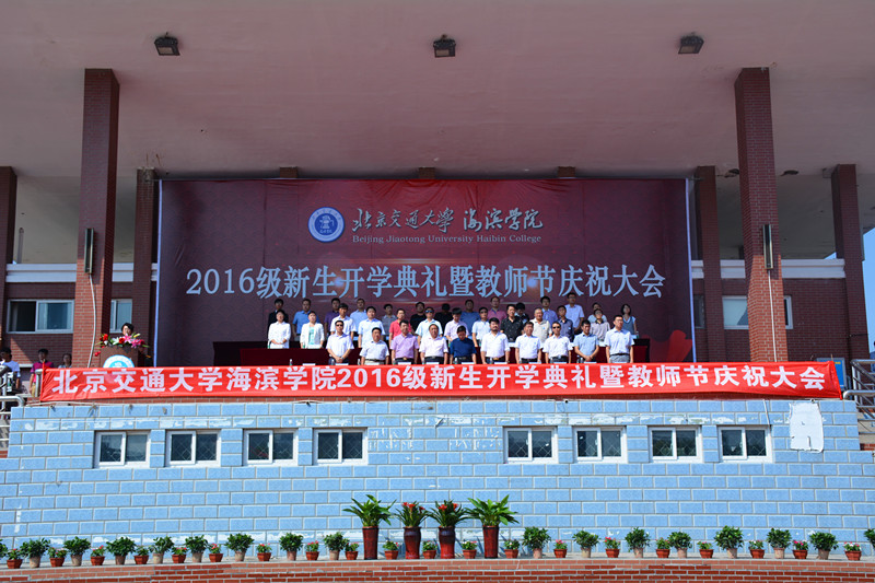 9月8日上午10点,德赢官网2016级新生开学典礼暨教师节庆祝大会隆重举行。北京交通大学党委副书记高福廷,黄骅市人民政府副市长郑增强,祥兴集团副总裁张在兴、薛君南、徐连跃,我院院长、党委书记王化深,副院长、副书记张长铎,副院长张乐乐、薛爱兴、徐爱国,党委副书记魏炜以及各教学单位负责人、各职能处室负责人出席典礼。德赢官网来自25个不同省市地区的3352名2016级新同学在辅导员老师的带领下整齐列队参加典礼。典礼由副院长张乐乐主持。