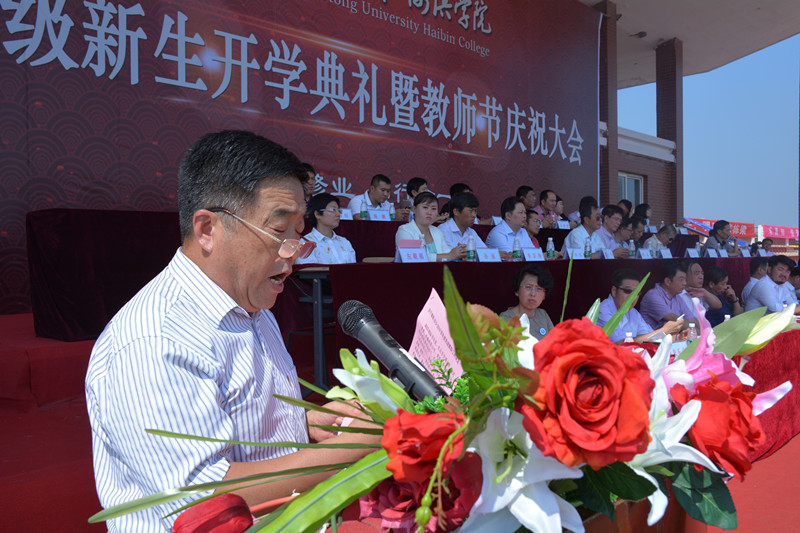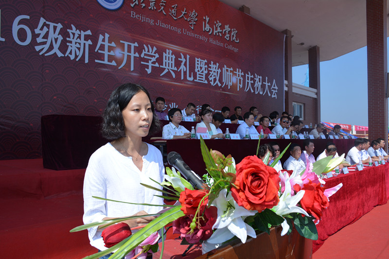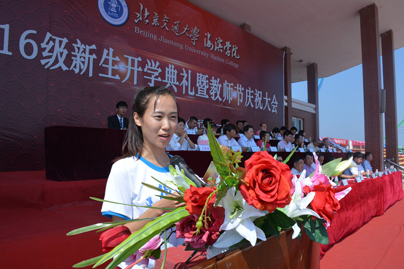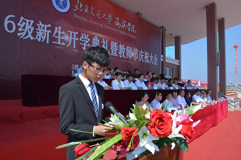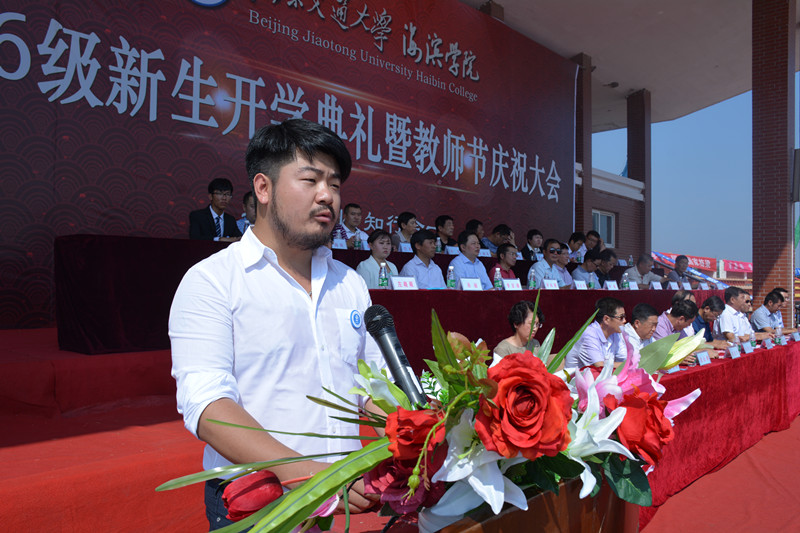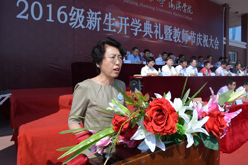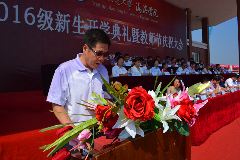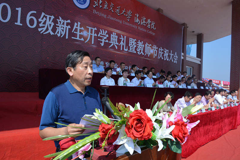 北京交通大学党委副书记高福廷致辞,首先高书记代表北交大向2016级新生表示热烈的欢迎,在第32个教师节来临之际,祝海滨学院全体教师节日快乐!高书记表示海滨学院虽然是一所年轻的学校,但是在师资队伍和人才培养模式上有着自己鲜明的特色,并表示北交大母校始终关心和支持着海滨学院的建设发展,同时热情地邀请同学们在9月10日关注北京交通大学120周年庆!