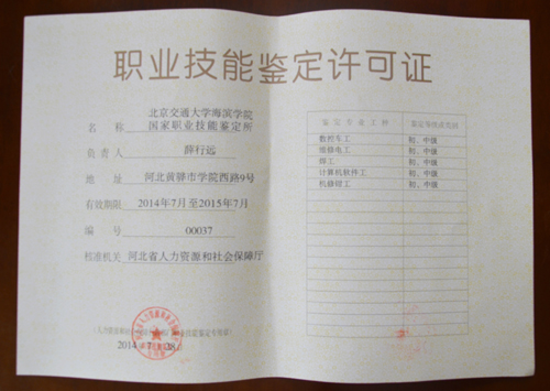 7月28日,河北省人力资源和社会保障厅正式向我院颁发职业技能鉴定许可证,标志着我院国家职业技能鉴定所获批成立。首批具备鉴定资格的专业工种包括数控车工、维修电工、焊工、计算机软件工、机修钳工五个工种。