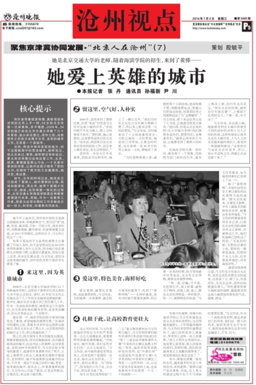 7月2日,沧州晚报第5版刊发《她爱上英雄的城市》,整版报道我院大学英语教研室负责人马玉玲老师。文章以人物为视角聚焦京津冀协同发展。在接受记者采访时,马玉玲老师全面介绍了来我院工作五年来的难忘经历和切身感受。