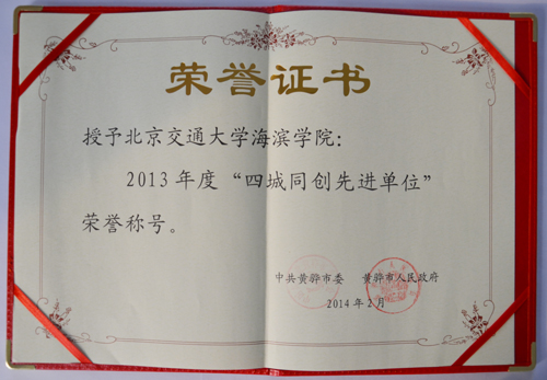 2月20日,黄骅市召开全市经济社会发展三级干部大会,对2013年度为全市经济社会发展做出突出贡献的先进集体和先进个人进行表彰。我院被授予2013年度“四城同创先进单位”荣誉称号。薛爱兴副院长代表学院参加会议并上台领奖。