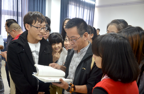 开幕式结束后,全体领导、来宾及师生代表走进艺术系展室观看展览。赵飚老师还现场讲解和展示了篆刻的创作过程,与我院师生亲切交流心得体会,并对我院学生的篆刻作品给予点评和指导。