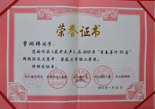 1月22日,从河北新闻网“青春善行90后”网络征文大赛组委会获悉,我院经济管理系工商管理专业1107班学生曾琳玮的作品《花开无声》荣获网络征文大赛大学组二等奖。