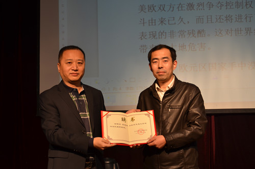 11月3日晚七点,中国西部人才开发基金会资源战略研究所所长宋健坤博士兼职教授聘任仪式暨专题报告会在我院实验楼报告厅举行。副院长周俞波、各相关单位负责人出席会议。我院经济管理系500余名同学参加会议。会议由周俞波副院长主持。
