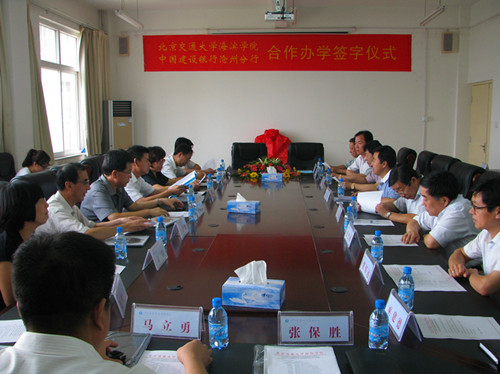 仪式由王大勇执行院长主持,王院长首先介绍了学院的总体情况及校企合作的基本思想。指出做好学院首届毕业生的就业工作是我院目前工作的重点之一,而校企合作的目的之一就是为黄骅及周边经济区发展培养专业知识过硬、动手能力强的毕业生,推动该地区的经济发展。中国建设银行沧州分行韩文金行长对我院办学取得的成绩表示祝贺,他认为海滨学院的创办结束了沧州地区无本科院校的历史,为沧州地区的经济、文化发展带来新的活力,推动沧州地区的经济更加快速发展。