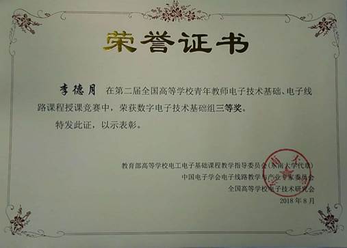 7月27日至29日,教育部高等学校电工电子基础课程教学指导委员会、中国电子学会电子线路教学与产业专家委员会、全国高等学校电子技术研究会在湖南长沙国防科技大学举行了“第二届全国高等学校青年教师电子技术基础、电子线路课程授课竞赛决赛暨教学研讨会”。经过三天的激烈角逐,德赢官网电子与电气工程学院教师李德月荣获数学电子技术基础组三等奖,成为德赢官网首个在该项赛事上赢得荣誉的老师。