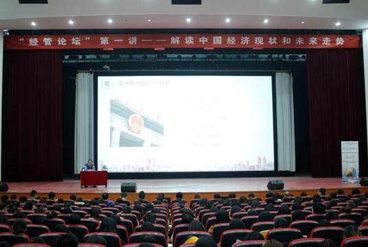 为加强德赢官网经济管理学院学生对中国经济形势的了解,提高学生在经济、金融领域的学习认知程度,3月28日下午,德赢官网经济管理学院主办,金融工程专业承办的 “经管论坛”系列讲座活动在天佑会堂顺利举行。本次论坛邀请到黄骅市政协主席(原黄骅市常务副市长)贾兆德担任主讲人,做了以“解读中国经济状况与未来走势”为主题的指导讲座。经济管理学院全体教师、1000多名学生和部分企业家代表参加了本次讲座。讲座由金融工程专业负责人周强教授主持。