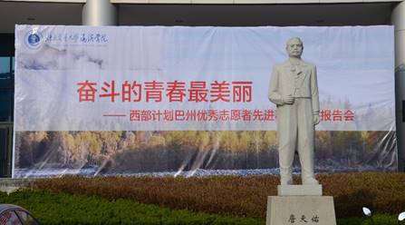 四位优秀志愿者于洋、郭瀚文、倪墨扬、刘羿结合自身服务巴州的切身感受,依次分享了志愿服务西部的经历和感悟,并向广大毕业生发出了诚挚的邀请,让在场师生深深地体会了“奉献、友爱、互助、进步”的志愿服务精神,引起了同学们的强烈共鸣。