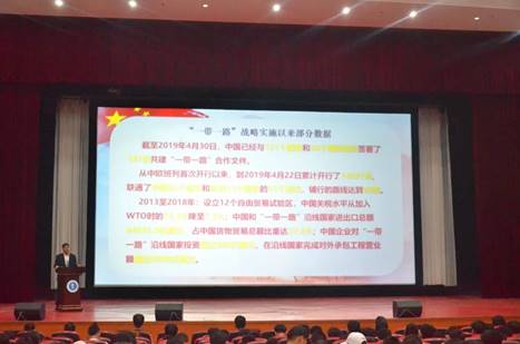 随后,王校长结合“一带一路”战略提出的历史背景,详细介绍了由此带来的文化价值、政治意义和现实意义,通过展示“一带一路”战略实施以来的部分数据,向同学们阐述了随着“一带一路”战略的不断推进,丝路文化在新时代被赋予了更加深刻的内涵和重要的地位。同时告诉同学们中国由穷到富、由富到强的崛起是靠信心、靠我国的发展理念而来。