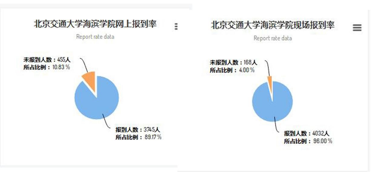 在现场报到时,学校采用了“扫码报到”的方式,实时了解学生的基本信息和缴费情况,完成文化衫等物品的发放、宿舍分配、一卡通领取、宿舍钥匙领取等流程。在迎新系统后台,学校领导和管理人员可以实时查看报到数据的变化,随时掌握迎新报到的现场进度,包括学校整体报到情况,各学院、各专业报到人数和报到率。通过实时数据的展示,可以更好地统筹迎新现场的工作部署,同时产生的迎新数据也能为进一步的学生工作提供参考支撑。