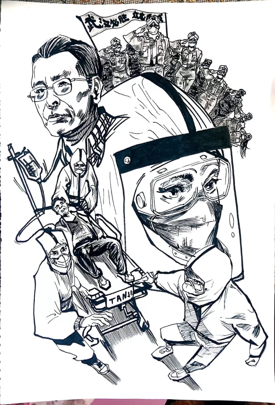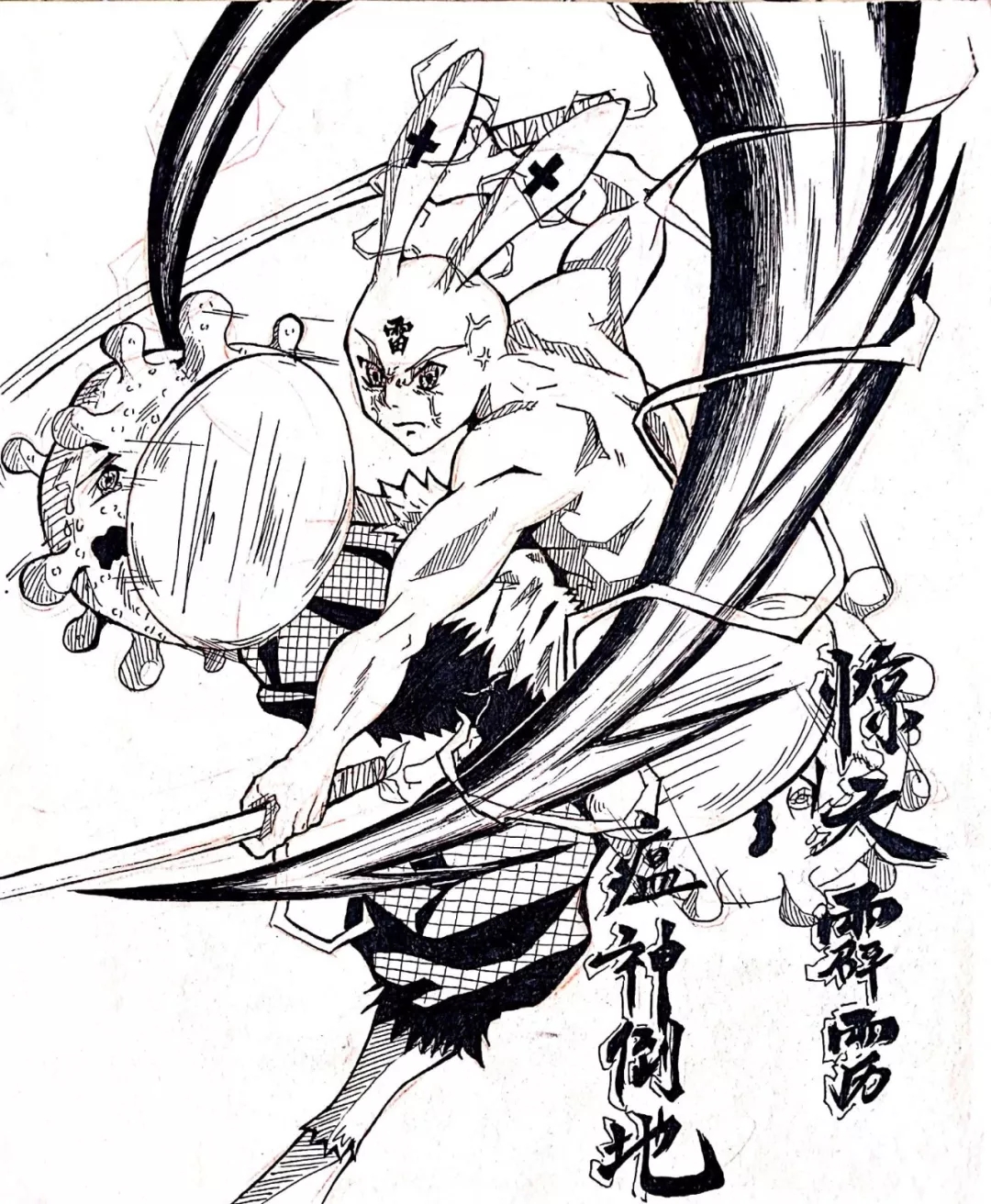 作品取材自雷神山医院,用白色兔子代表医院里的医生,雷神怒斩病毒,闪电直击要害。祝愿病毒早日被消灭,疫情快快结束。