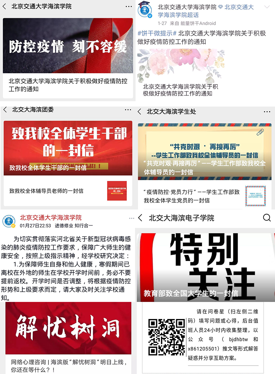 德赢官网建立疫情信息报告体系,对全校教职员工的出行及身体、生活情况进行摸排,并通过校园网、微信、微博、师生群等多种渠道,开展有效的疫情防控教育,引导师生做好自我防护,科学理性认识疫情,不信谣、不传谣,积极完成网络课程的“教”与“学”。学生处面向全校学生开展网络心理咨询服务,保证学生情绪稳定,维护学生心理健康。