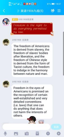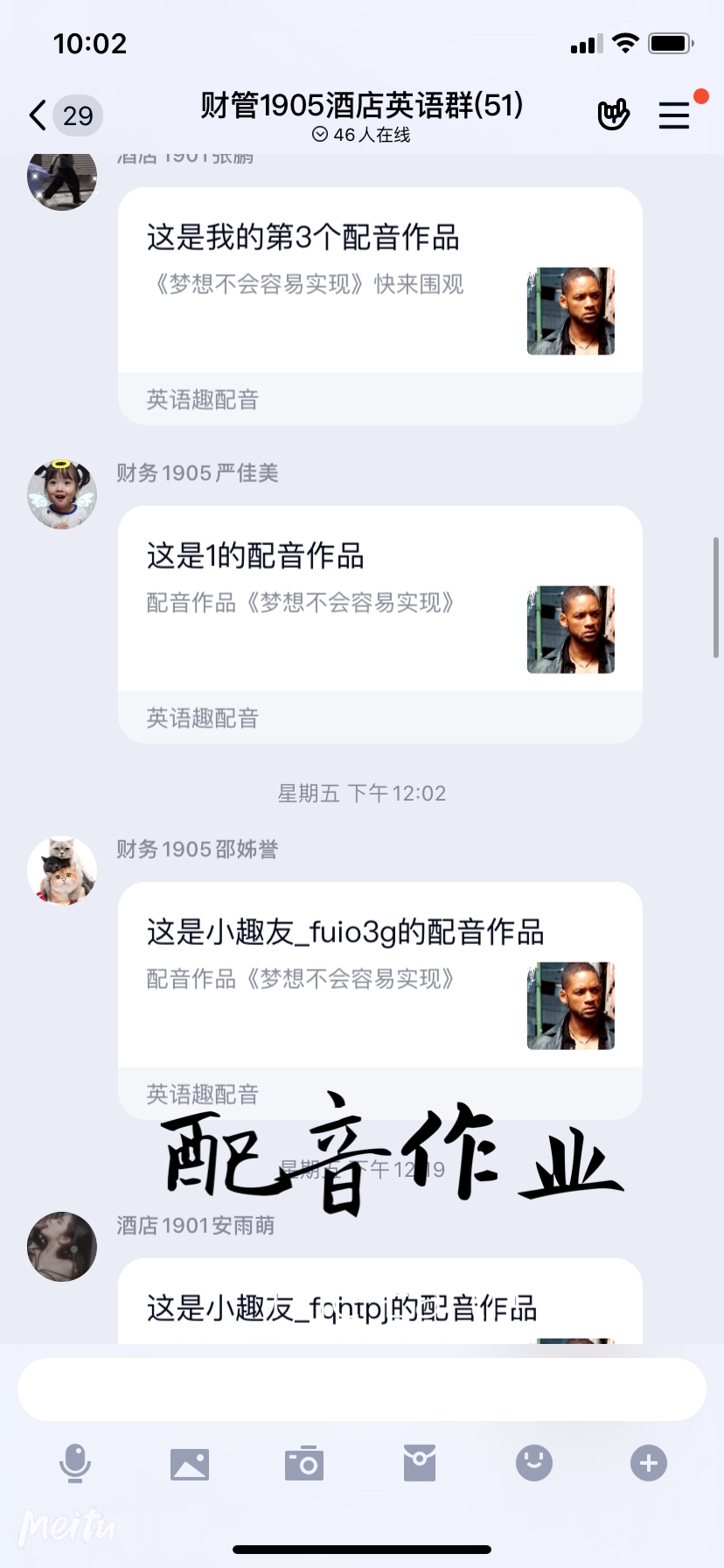 尽管老师们为顺利地开展网络授课,做了大量的准备工作,为提高学生的课堂参与度,设置了各种互动方式,但是由于网络卡顿或者学习环境的限制,学生的“说”在网络授课期间受到了影响。但这难不倒梁美丽、刘经伟两位老师。梁老师利用趣配音app,让学生录制自己的配音作品,并将优秀作品进行课堂展示。刘经伟老师在QQ群展开英语大讨论,以“写”代“说”,很好地激发了学生想“说”的积极性。