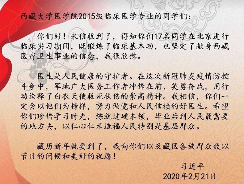 2020年2月21日,习近平总书记给正在北京大学首钢医院实习的西藏大学医学院学生回信,肯定了他们献身西藏医疗卫生事业的信念,勉励他们珍惜学习时光,练就过硬本领,造福基层群众,并向他们以及藏区各族群众致以节日的问候和美好的祝愿。德赢官网党委高度重视、精心安排,在全校范围内掀起了学习习总书记回信精神的热潮,师生引发强烈反响。