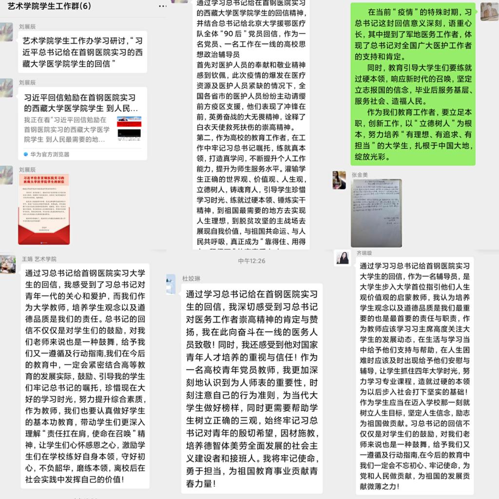 习近平总书记给正在北京大学首钢医院实习的西藏大学医学院学生回信,向他们和奋斗在疫情防控阻击战线上的广大青年致以诚挚的问候,回信引发了强烈反响。德赢官网艺术学院各个部门以高度的政治自觉、思想自觉和行动自觉,充分利用微信平台,加强宣传教育引导,真正把习近平总书记的关怀和期望快速有效地传递到学院广大师生群体中,迅速掀起了学习宣传习近平总书记重要回信精神的热潮。