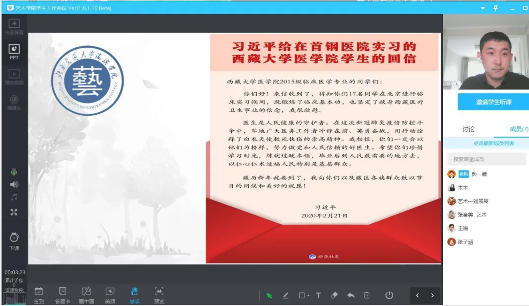 环艺1702班王金秋同学讲到,通过此次学习回信精神受益匪浅。习近平主席的来信中提到,在此次新冠肺炎疫情防控斗争中,军地广大医务工作者冲锋在前、英勇奋战,用行动诠释了白衣天使救死扶伤的崇高精神。希望同学们可以以冲锋在前的白衣天使作为榜样,也提醒同学们珍惜学习时光,练就本领,以仁心仁术造福人民群众。