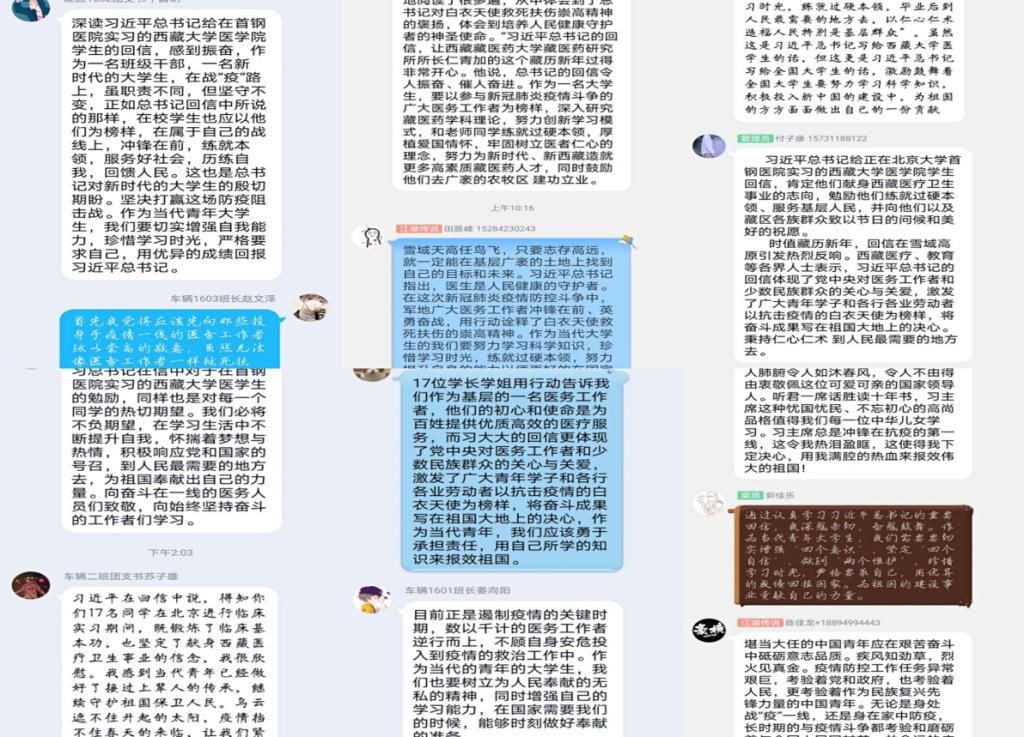 在藏历新年来临之际,抗击疫情的攻坚时刻,习近平总书记于2月21日给正在北京大学首钢医院实习的西藏大学医学院学生回信。德赢官网机械与动力工程学院积极响应学校学习习近平总书记的回信精神,充分利用视频会议及QQ平台,学院教师、辅导员和学生分别进行学习讨论,认真研读习近平总书记的重要回信