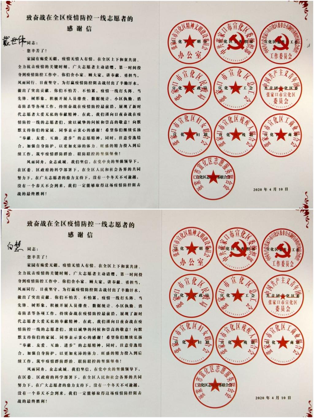 2月9日,白慧、戴世伟两位同学一起通过志愿汇APP加入到张家口市爱心公益促进会,并积极响应宣化区团委志愿者招募的号召,加入张家口市宣化区团委创立的“青葡”志愿者团队,成为抗疫志愿者,正式开展志愿服务工作。他们二人先后协助社区进行市内外返宣人员登记、大东村出入证发放、张贴疫情宣传资料、参与西城社区二轮入户排查登记等工作,在永欣小区、钢鑫小区、94号院等小区进行防疫值守与人员车辆出入信息登记,同时利用微信、QQ以及微博等软件宣传志愿服务与防疫知识。两位同学累计线上、线下服务共计933.4小时(戴世伟同学467.4小时,白慧同学466小时)。