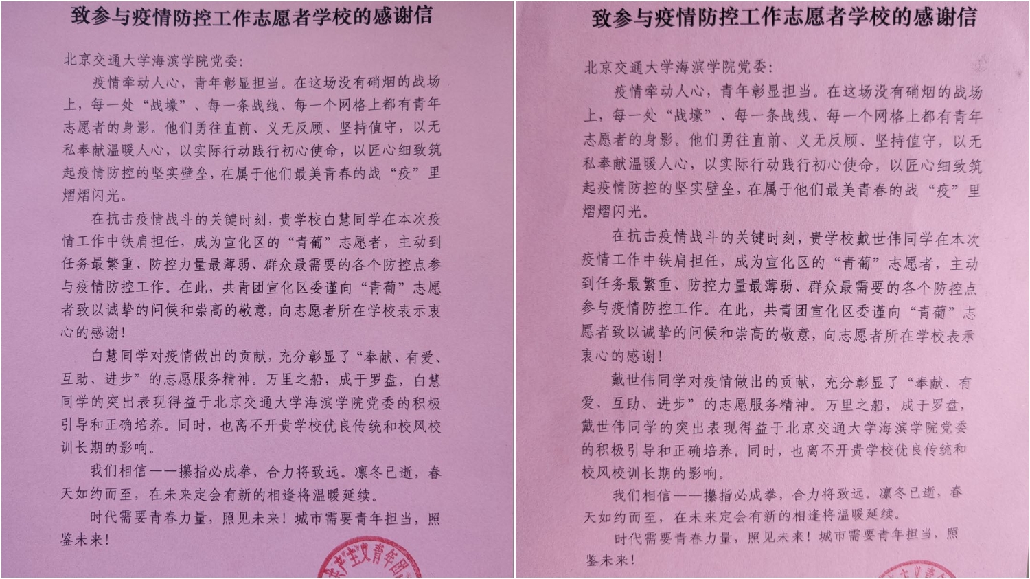 白慧、戴世伟两位同学为社区民众做出了突出贡献,对此,他们表示:身为新时代海滨学子能够为自己的家乡贡献一份力量,将学校的优良教育与素质培养加以体现,我们感到无比的骄傲自豪!