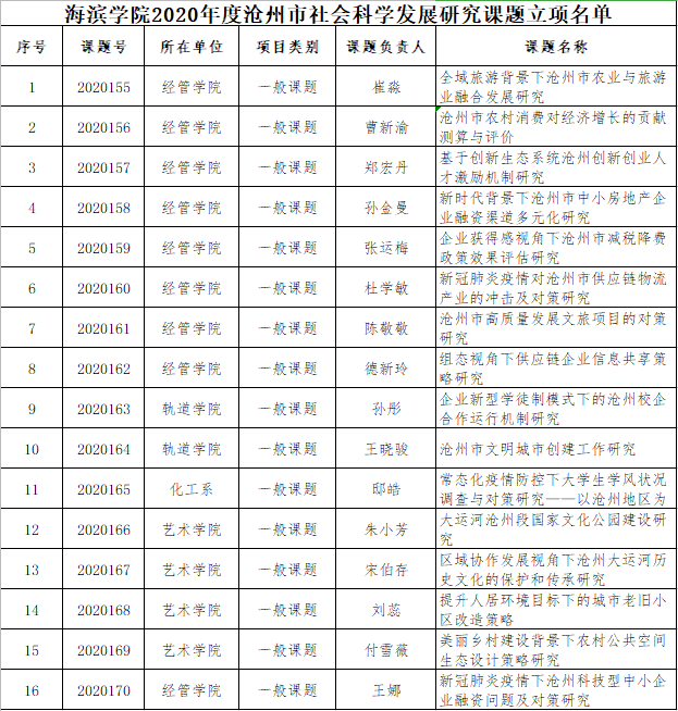 4月9日,沧州市社会科学界联合会组织开展2020年度沧州市社会科学发展研究课题申报工作。德赢官网科技处根据《2020年度沧州市社会科学发展研究课题指南》要求,积极组织各单位申报,于4月21日报送课题共计29项。5月15日,经沧州市社会科学界联合会评审,确定德赢官网2020年度沧州市社会科学发展研究课题获准立项16项。
