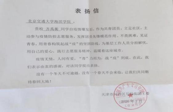齐禹蘅同学说:“在担任志愿者的过程中,我每天在小区门口为进出居民测量体温、进行登记。在寒冷的天气中,我拿着体温枪进行测量,经常手被冻得僵硬。虽然过程很辛苦,但是我觉得能在疫情期间做一件力所能及的事非常有意义,有着满满的幸福感。”在志愿者活动结束后,当地街道办事处向齐禹蘅同学发放表扬信,感谢他在疫情期间的辛苦付出。