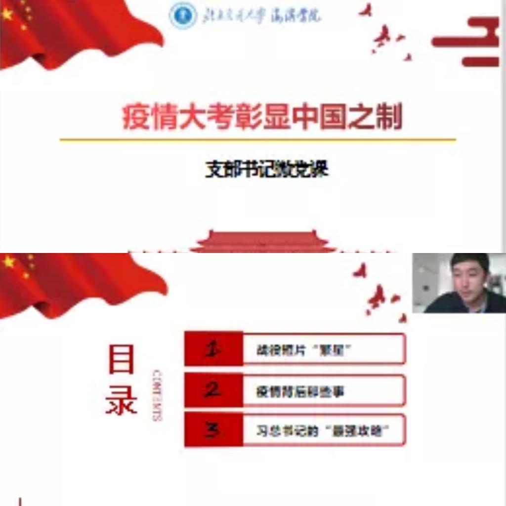 活动第一项,艺术学院直属党支部书记彭一腾以新冠疫情带给大家的精神启示和实践教育为主线,开展意识形态教育,通过战疫短片“繁星”、疫情背后那些事、习近平总书记的“最强攻略”三个部分,讲述了“疫”堂“疫情大战彰显中国之制”云党课,让党员师生真正增强“四个意识”,坚定“四个自信”,做到“两个维护”。