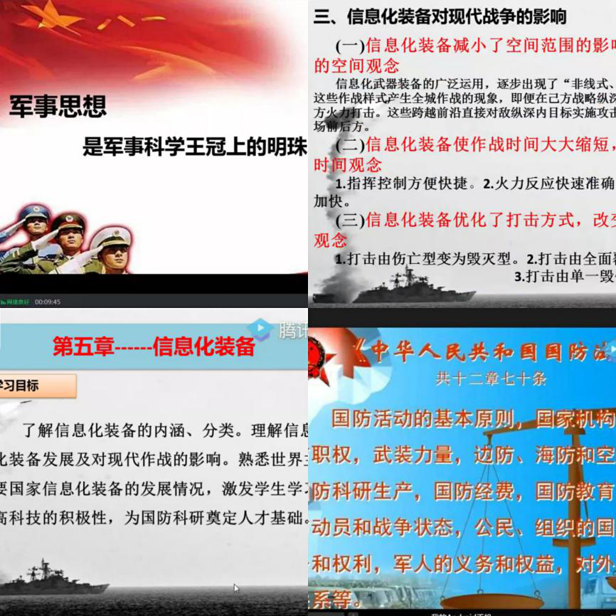 新的教学模式往往带来新的挑战,新的挑战又会迸发出新的火花。面对疫情带来的线上教学挑战,德赢官网军事理论课所有任课教师把国防教育与疫情防控紧密结合,紧贴疫情防控时事精心备课,依托腾讯会议、腾讯课堂、QQ群课堂等多种平台,以班级为单位组建微信、QQ群,分别开展军事思想、现代战争、信息化装备和中国国防四门课程,传承红色基因,激发学生爱国情怀,将”课程思政”元素融入军事理论课教学。