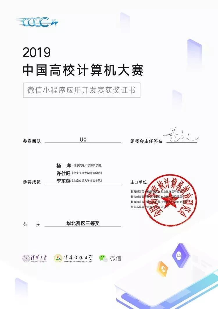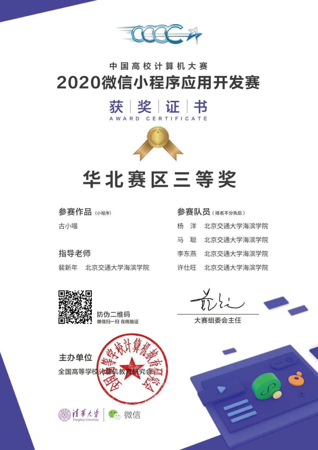 近日,2020中国高校计算机大赛微信小程序应用开发赛正式落下帷幕,德赢官网指导老师裴新年带领杨洋、马聪、李东燕、许仕旺四人组成的团队参赛作品《古小喵》荣获本次微信小程序应用开发赛华北赛区三等奖。其中,杨洋、许仕旺、李东燕在2019年中国高校计算机大赛微信小程序应用开发赛以优秀作品《社团秘书》荣获华北赛区三等奖。