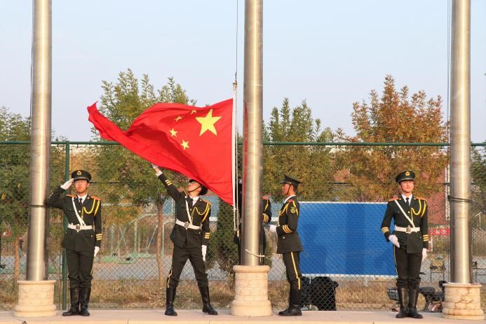 本次典礼在雄壮的国歌声中拉开帷幕,五星红旗冉冉升起,全场师生庄严肃立,行注目礼。
