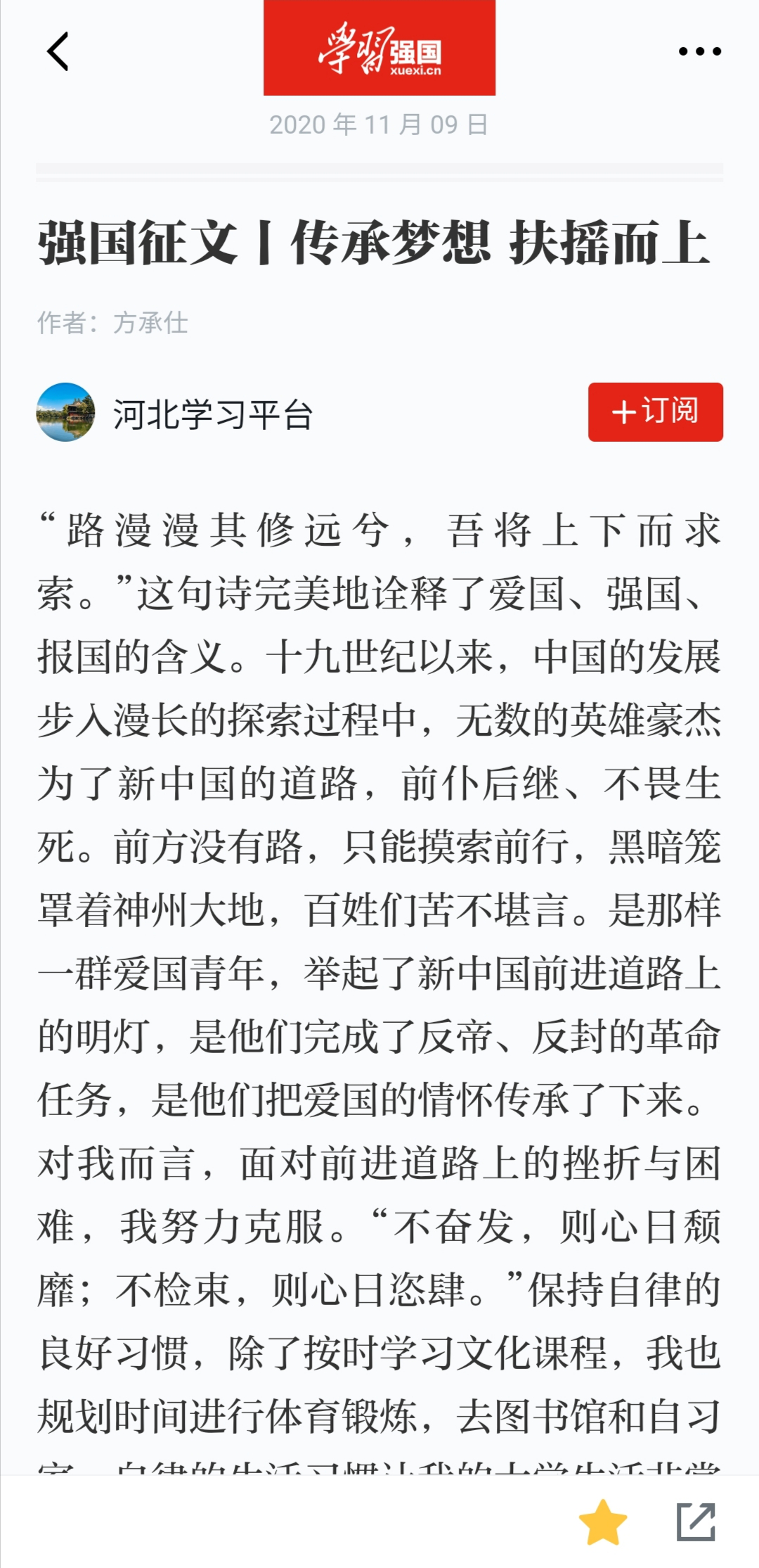 近日,德赢官网计算机信息与技术学院软件工程1705班方承仕的作品《传承梦想,扶摇而上》在“学习强国”学习平台“强国征文”栏目刊登。文章以新中国道路发展中不畏生死、前仆后继的爱国英雄事迹为切入点,以个人与国家、个人与时代的关系为角度,通过所见所闻、所学所思,抒发爱国之心、报国之情、强国之志。现全文转载如下: