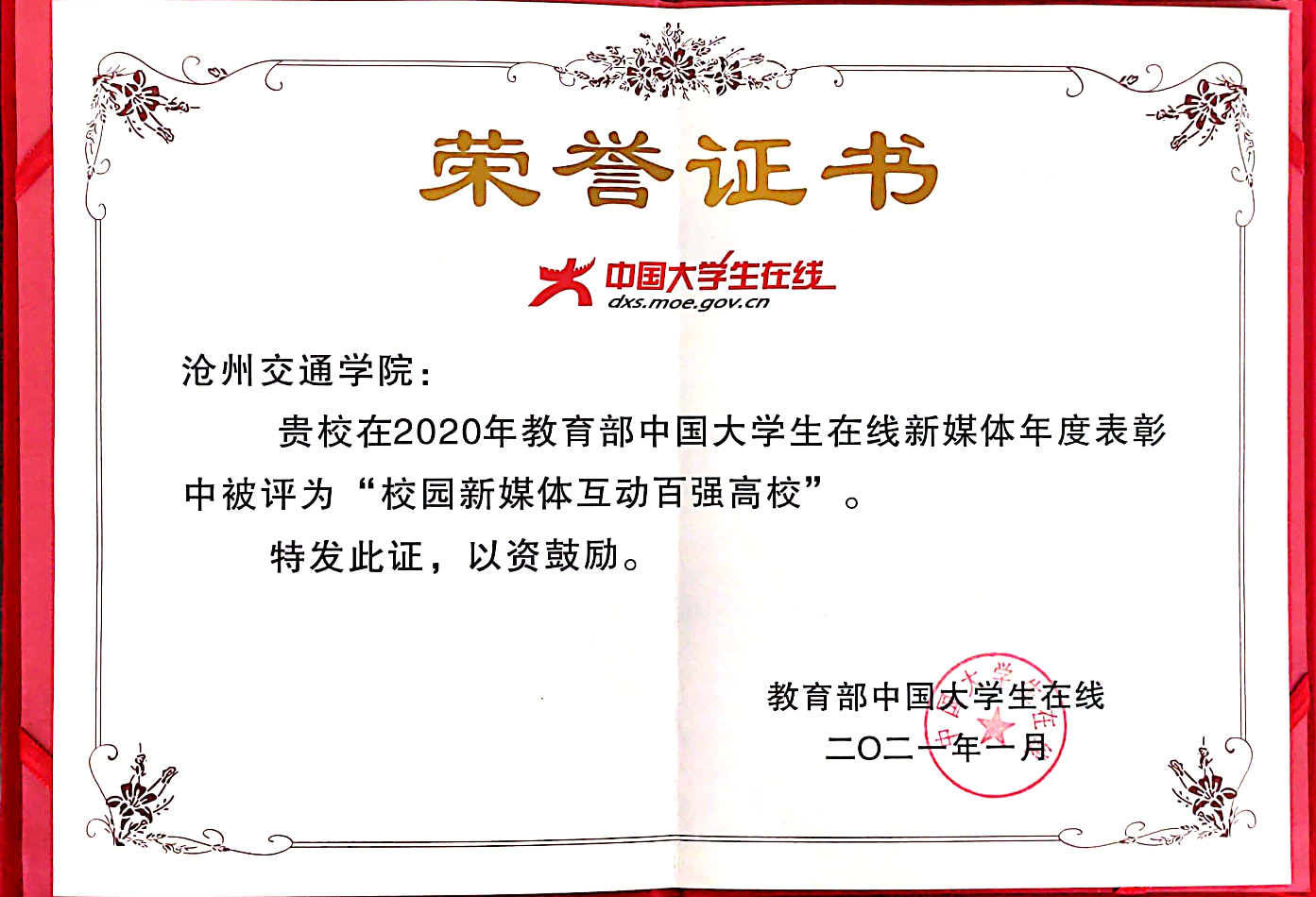 近日,教育部中国大学生在线2020年度新媒体表彰名单公布,德赢官网荣获“中国大学生在线校园新媒体互动百强高校”称号。