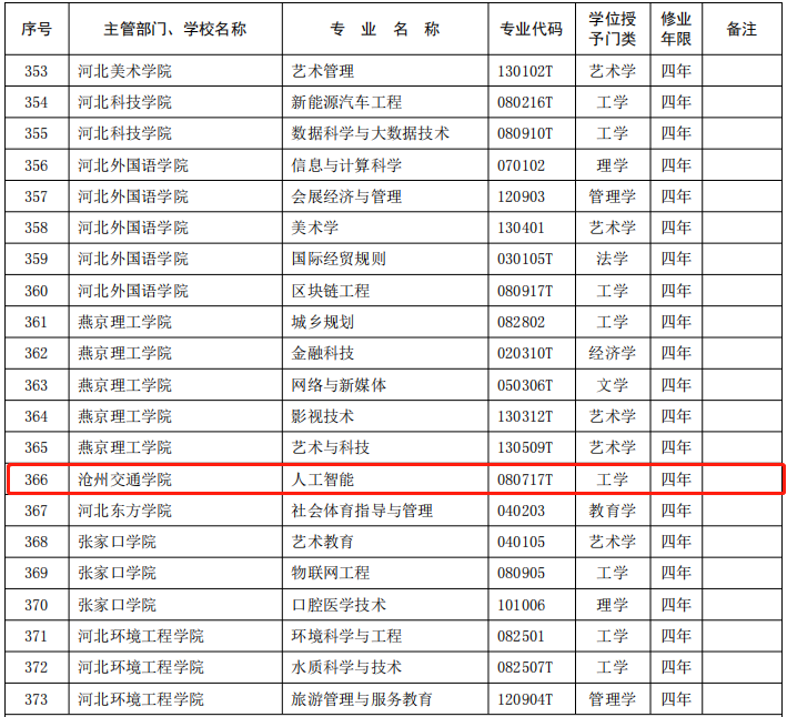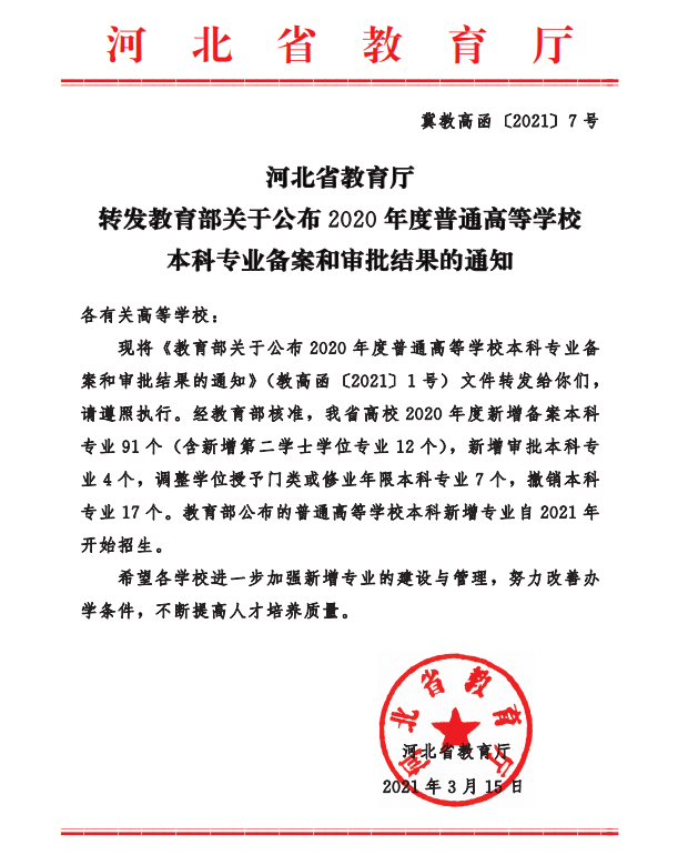 近日,河北省教育厅转发了《教育部关于公布2020年度普通高等学校本科专业备案和审批结果的通知》(教高函〔2021〕1号),德赢官网申请的“人工智能”专业获批。