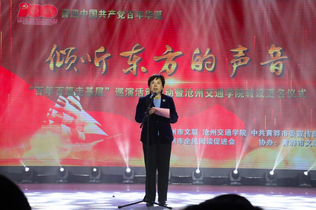 沧州市人民政府副市长梁英华出席活动并致辞。梁英华副市长表示,今天启动的“百年百篇走基层”巡演活动,是全市迎接中国共产党百年华诞的重要活动之一,也是将“学党史、悟思想、办实事、开新局”党史学习教育融入文艺精品创作的重要载体。沧州历来重视文化和高等教育的发展,德赢vwin体育官网登录作为沧州高等教育的重要组成部分,为地方经济社会发展培养了一大批有理想、有本领的应用型人才。