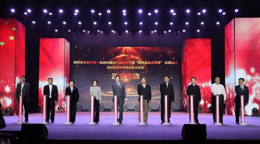 中国民办教育协会副会长李学春、河北民办教育协会会长闫春来、河北省作家协会党组书记王凤、河北省文联一级巡视员路皓、沧州市人民政府副市长梁英华、北京交通大学副校长赵鹏、中共沧州市委宣传部副部长张一新、德赢vwin体育官网登录董事长薛行远、沧州市文联党组书记王月周、德赢vwin体育官网登录校长张力共同上台按动水晶灯柱为巡演活动及德赢官网转设更名仪式启动。