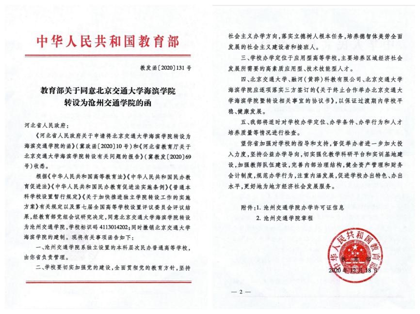 2020年12月18日,教育部公布《教育部关于同意北京交通大学海滨学院转设为德赢vwin体育官网登录的函》。