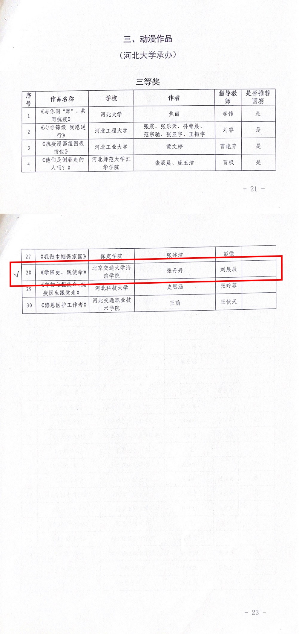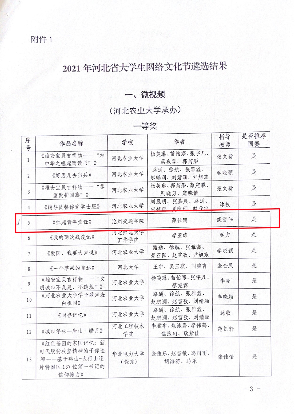 根据专家评审,德赢官网在2021年河北省大学生网络文化节活动共荣获一等奖作品3个,三等奖作品1个。教师候雪伟指导、学生蔡仕鹏创作的参赛作品《扛起青年责任》获得“微视频”一等奖,教师王文博指导、学生欧洋希创作的参赛作品《生命的活力》和教师候雪伟指导、学生崔言创作的参赛作品《新时代风貌》获得“摄影作品”一等奖,教师刘展辰指导、学生张丹丹创作的参赛作品《学“四史”、践使命》获得“动漫作品”三等奖。
