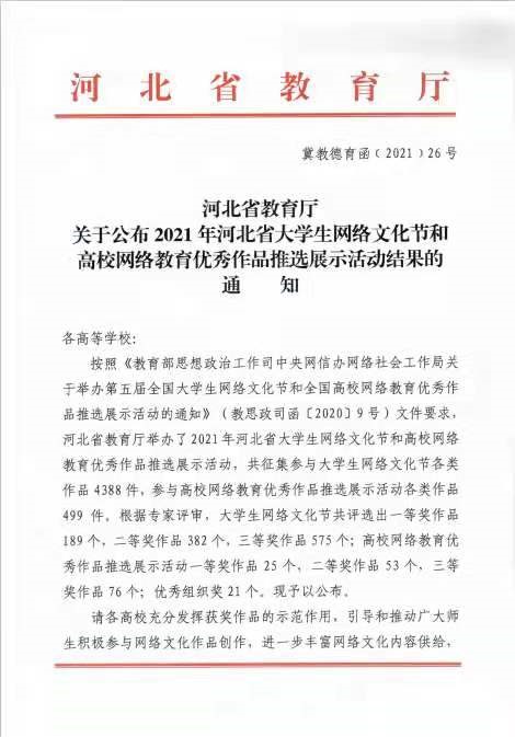 近日,由河北省教育厅组织的2021年河北省大学生网络文化节和高校网络教育优秀作品推选展示活动圆满结束,德赢官网四项参赛作品荣获奖项。