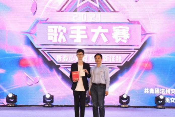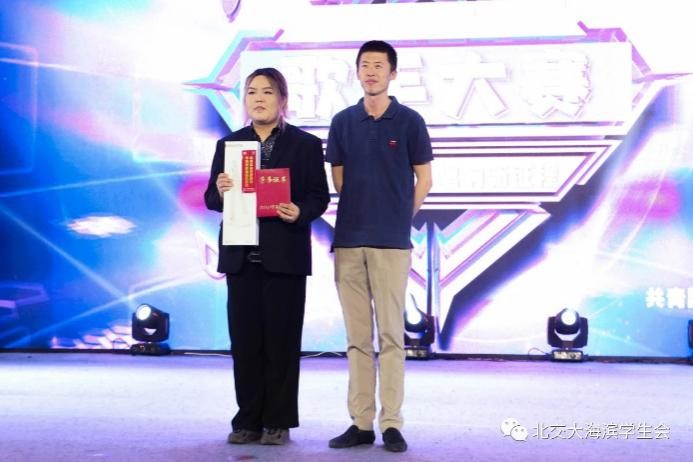 河北省音乐家协会会员,黄骅市文化馆副馆长,黄骅市音乐家协会副主席、秘书长黄亚慧为最佳曲风奖获得者郭昊临颁奖