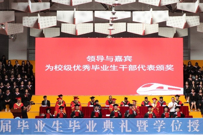 主席台前排领导与嘉宾为校级优秀毕业生代表颁奖。