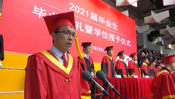 在神圣庄严的氛围中,全体师生起立,五星红旗在国歌中冉冉升起,德赢官网2021届毕业典礼正式拉开帷幕。