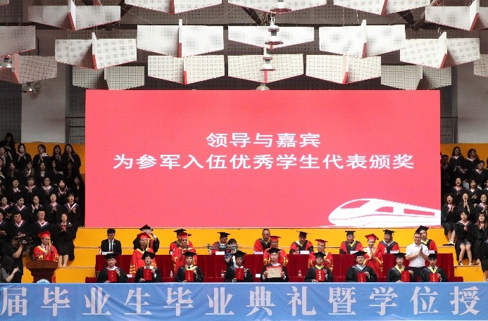 主席台前排领导与嘉宾为参军入伍优秀学生代表颁奖。