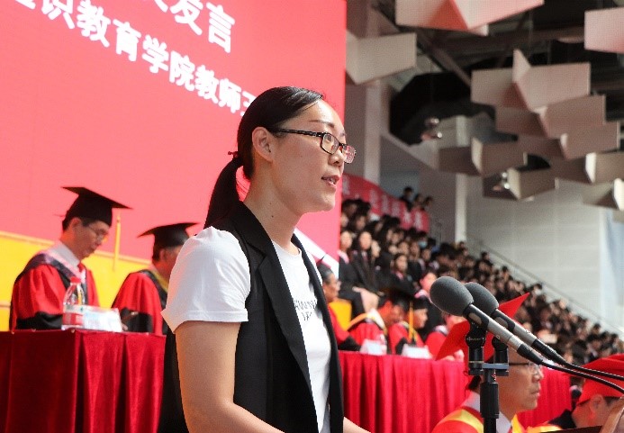 通识教育学院教师王小红作为教师代表发言,她祝贺同学们学习期满,顺利毕业。随后嘱托同学们在以后的人生道路上守护本心,要用智慧和勤奋为自己的未来做出注解和铺垫。最后她引用《后浪》中的话语鼓励毕业生们大胆拼搏,约定世界精彩处见。