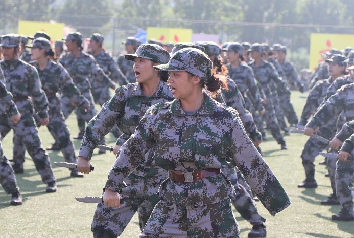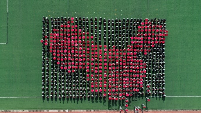 在《分列式进行曲》铿锵的节奏中,各个方阵依次迈着整齐的步伐走过主席台接受检阅,他们昂扬自信、雄姿英发、步履铿锵、神采飞扬,坚定的摆臂、整齐的步伐、嘹亮的口号彰显了2020级学子热情饱满的精神面貌。“出门看队伍,进门看内务”,寝室内务整理是军训的重要内容之一。内务表演方阵的学员们“铺平”“压实”“翻折”“捏角”,得心应手,游刃有余。在拼字方阵表演中,学员们不断变换阵型,摆出“中国”“党徽”“钟楼”等巨幅图案。以“青春之歌”唱响祖国,直抒爱党爱国情怀。女生匕首操表演气势恢宏、刚劲有力,透露出巾帼不让须眉的英雄气概,赢得看台观众阵阵掌声。男生们的军体拳表演犹如蛟龙出海、猛虎下山,展示出2020级学员的飒爽英姿。行云流水的动作让观众震撼称奇,一度将现场气氛推至高潮。