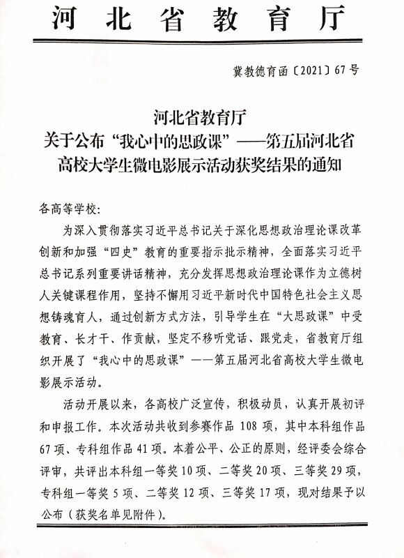 近日,河北省教育厅公布“我心中的思政课”第五届河北省高校大学生微电影展示活动获奖名单,德赢官网两项参赛作品荣获奖项。