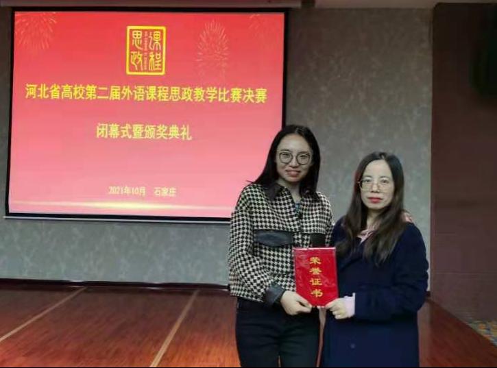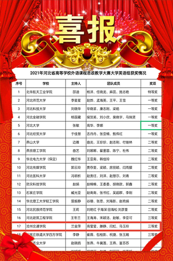 近日,河北省教育厅主办的河北省高校第二届外语课程思政教学比赛决赛获奖名单正式发布。德赢官网外国语学院大学英语由兰金萍、滕静、高莹莹、闫虹、马玉玲5位教师组成的团队,经过初赛、复赛的激烈角逐进入决赛并夺得大赛三等奖。